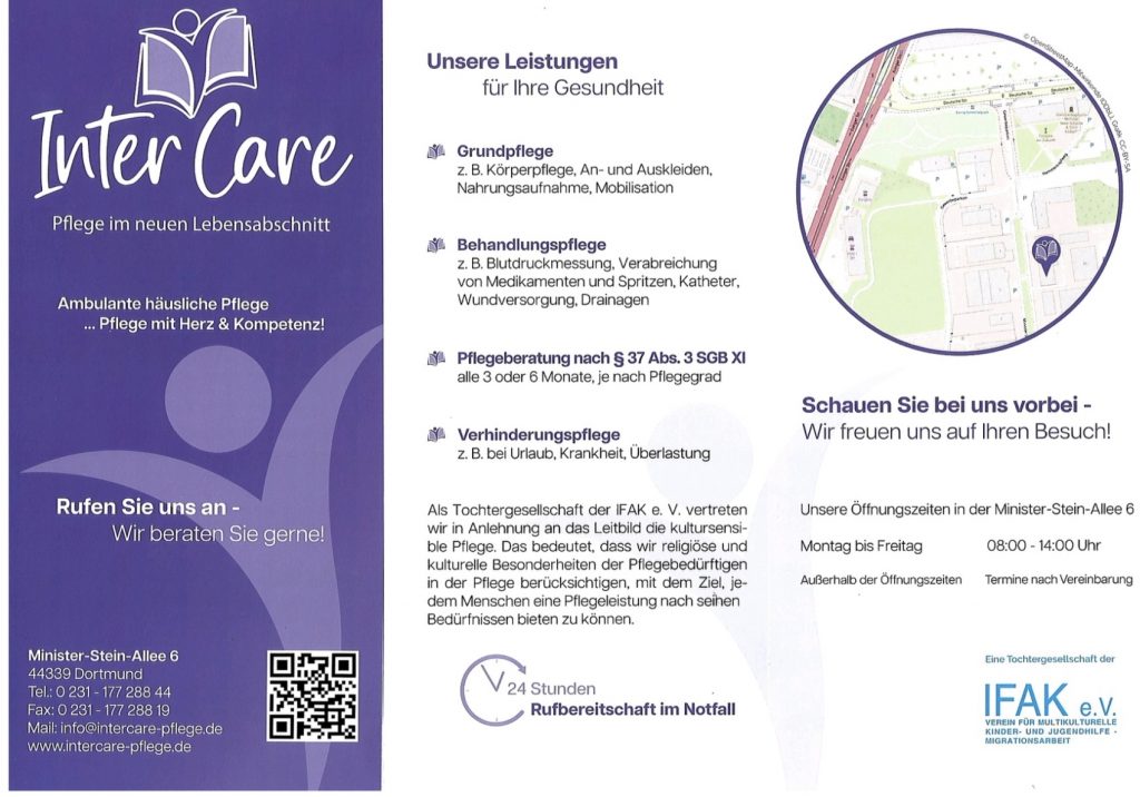 Endlich wird die Tochtergesellschaft der IFAK e.V., die InterCare GmbH (ambulanter Pflegedienst) sich auch in Dortmund auweiten. Wir stehen mit unseren Pflegedienstleistungen nun auch für alle Dortmunder zur Verfügung und freuen uns wenn wir Sie bald als unsere Kunden*innen begrüßen dürfen! Beratung und Informationen können Sie über die Telefonnummer 0173/3862640 in der Zeit von 9-15 Uhr erhalten.